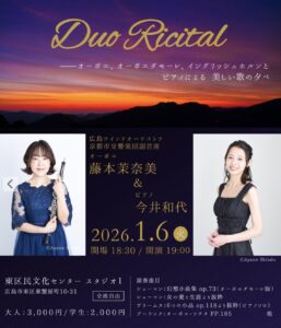 オーボエとピアノによる美しい歌の夕べ 日時:2026年1月6日(火) 開場18:30 開演19:00場所:広島市 東区民文化センター スタジオ1 チケットの購入はこちらから これまでの公演